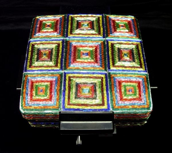 Dimensions: 3 1/2" H x 10 1/2" W x 10 1/2" D. I took a working waffle iron and encrusted it with approximately 13,500 multi-colored 1/4" glass bugle beads. It is non-working.